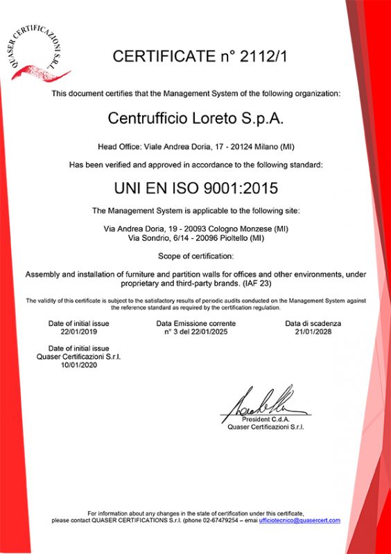 Centrufficio is certified in compliance with UNI EN ISO 9001