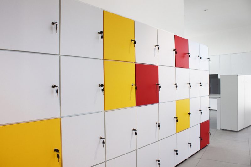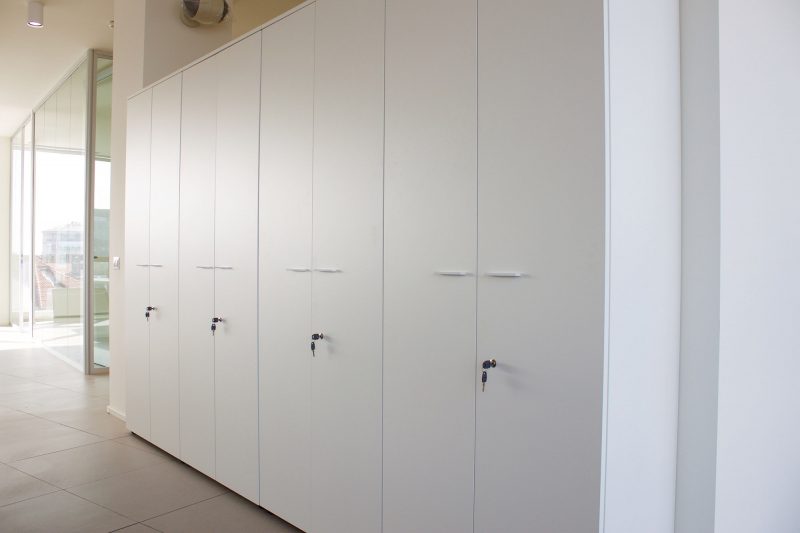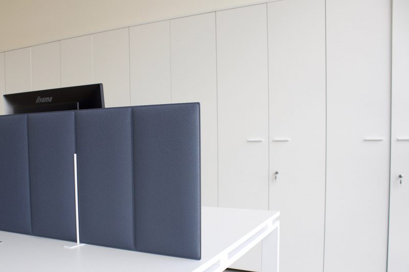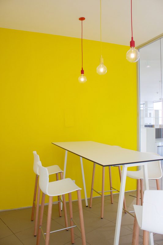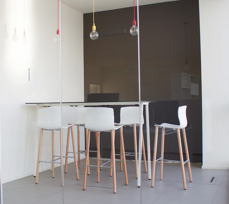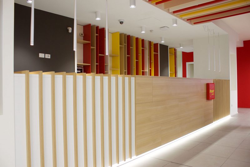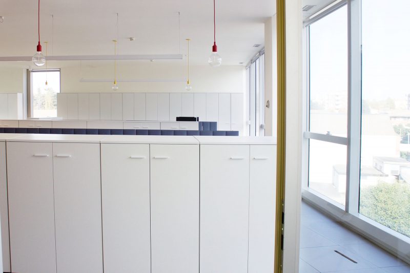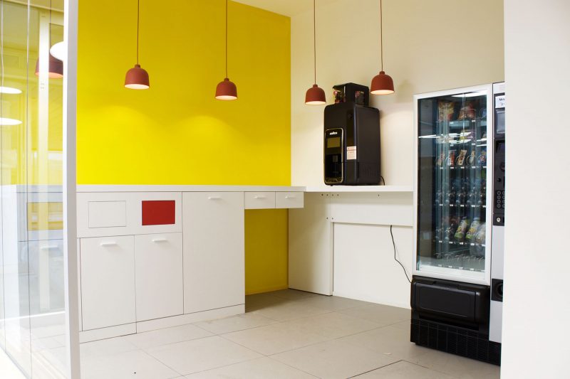 Furniture with table and bench made to measure by our woodworking department for the phonebooth rooms DORIA CUBE, filing cabinets, made in corporate colors Decorative wall coverings of break areas and common parts of entrances on different floors Movable partitions for the creation of meeting rooms and reserved spaces model IDRAWALL glazed