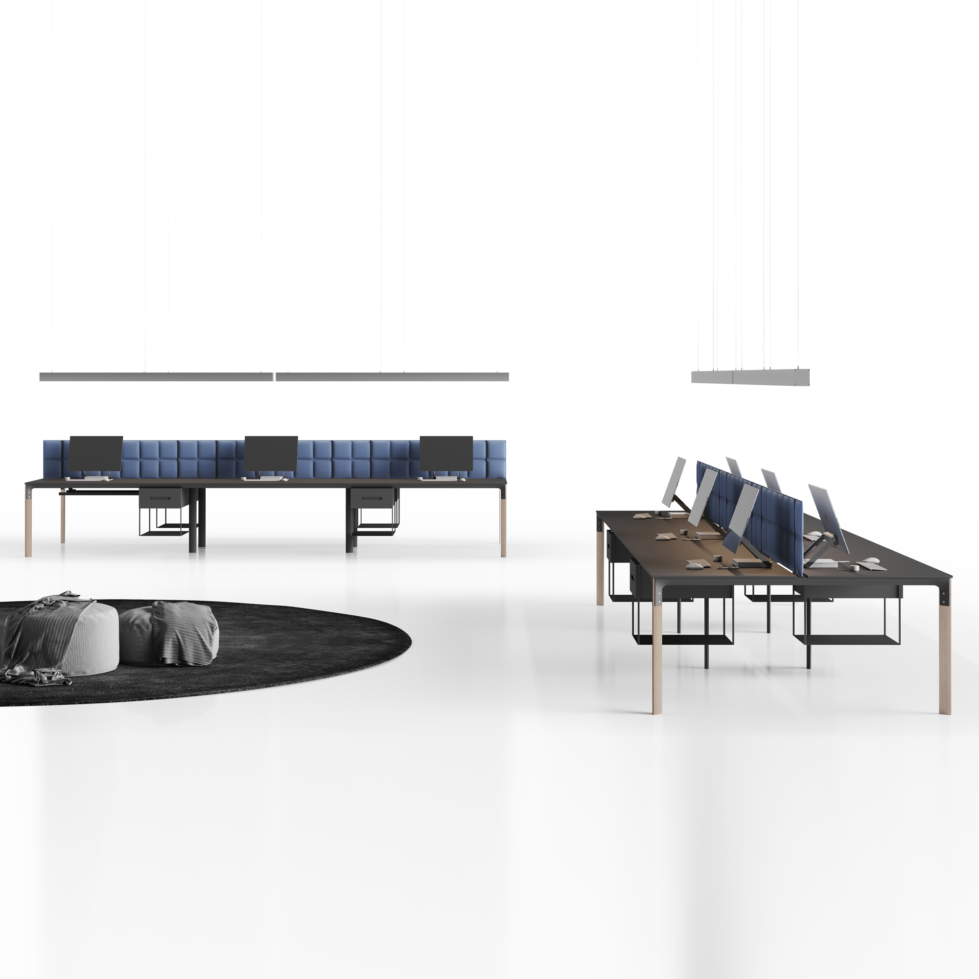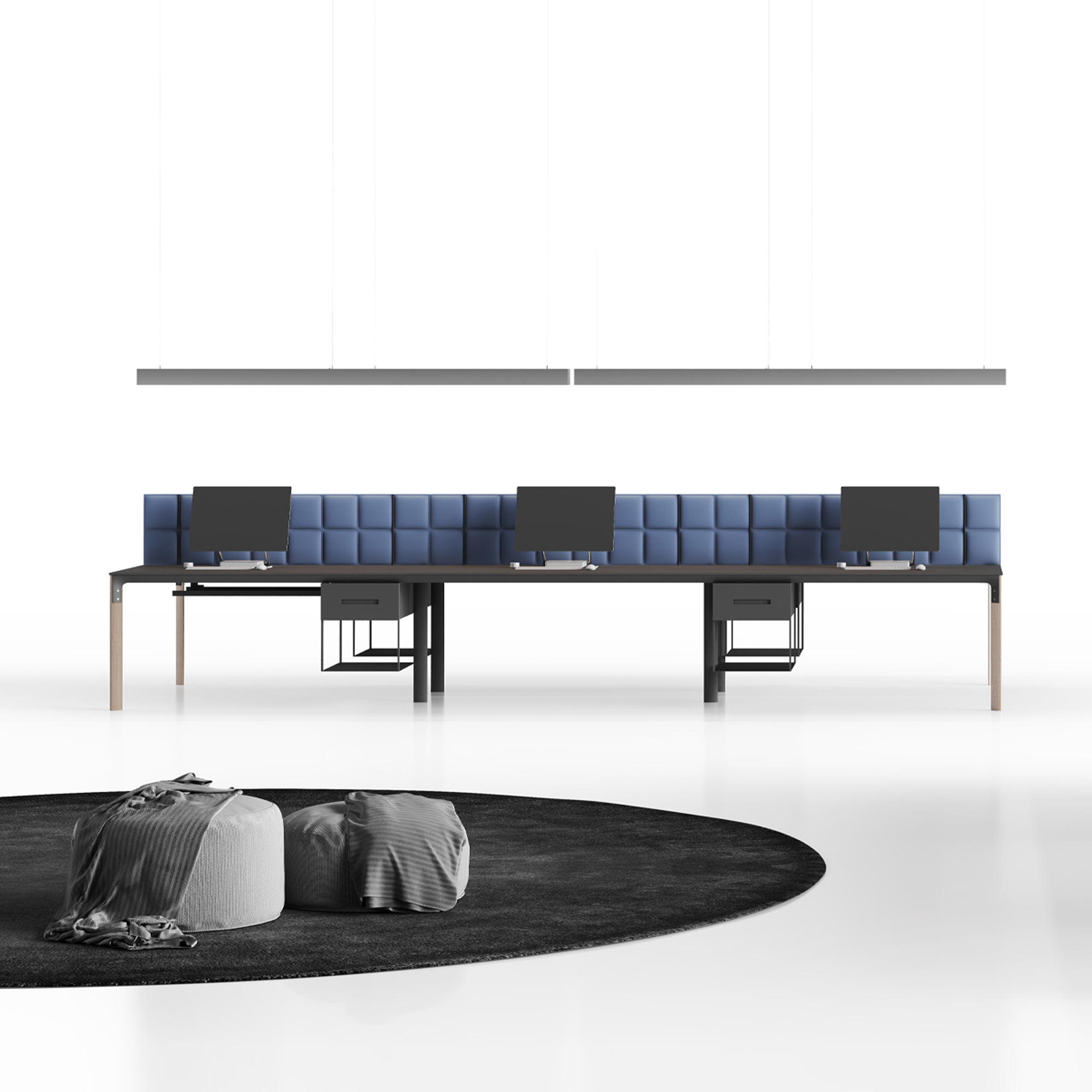 The final result is an operative desk series characterized by a light and contemporary aesthetics, a slim plane leans on top of a fleeing structure adorned by connection elements that, starting from the beams, evolve to embrace the table legs.