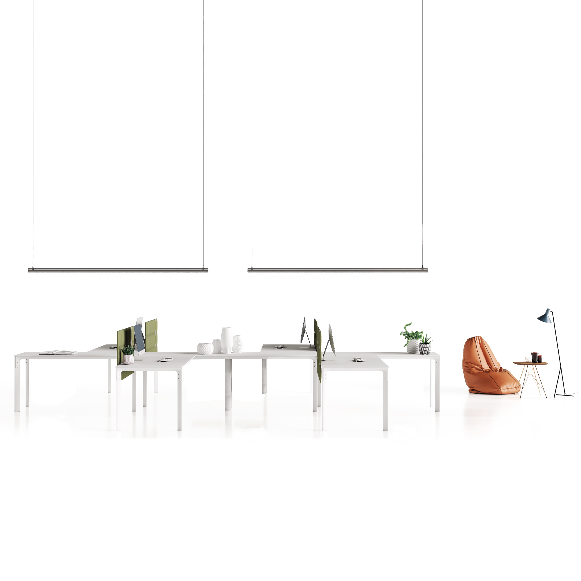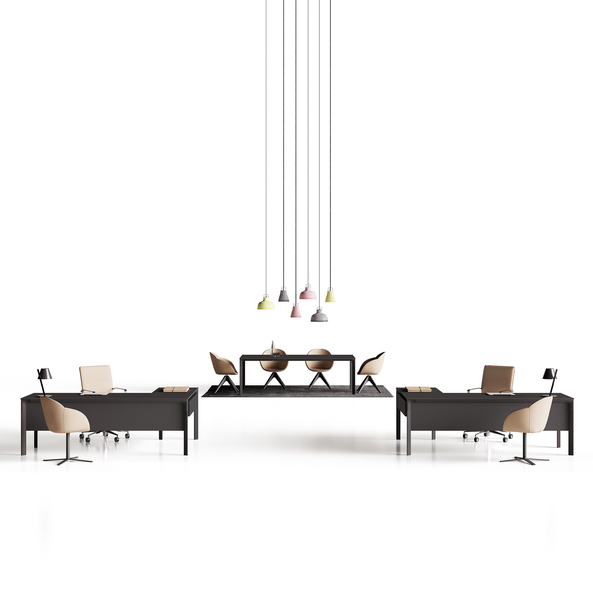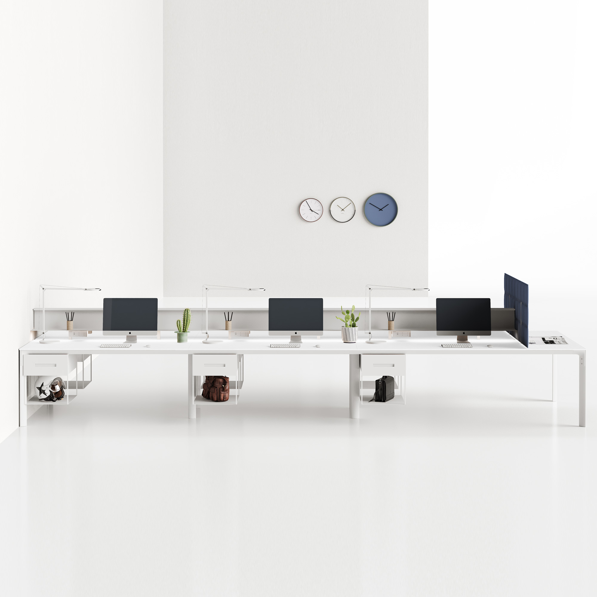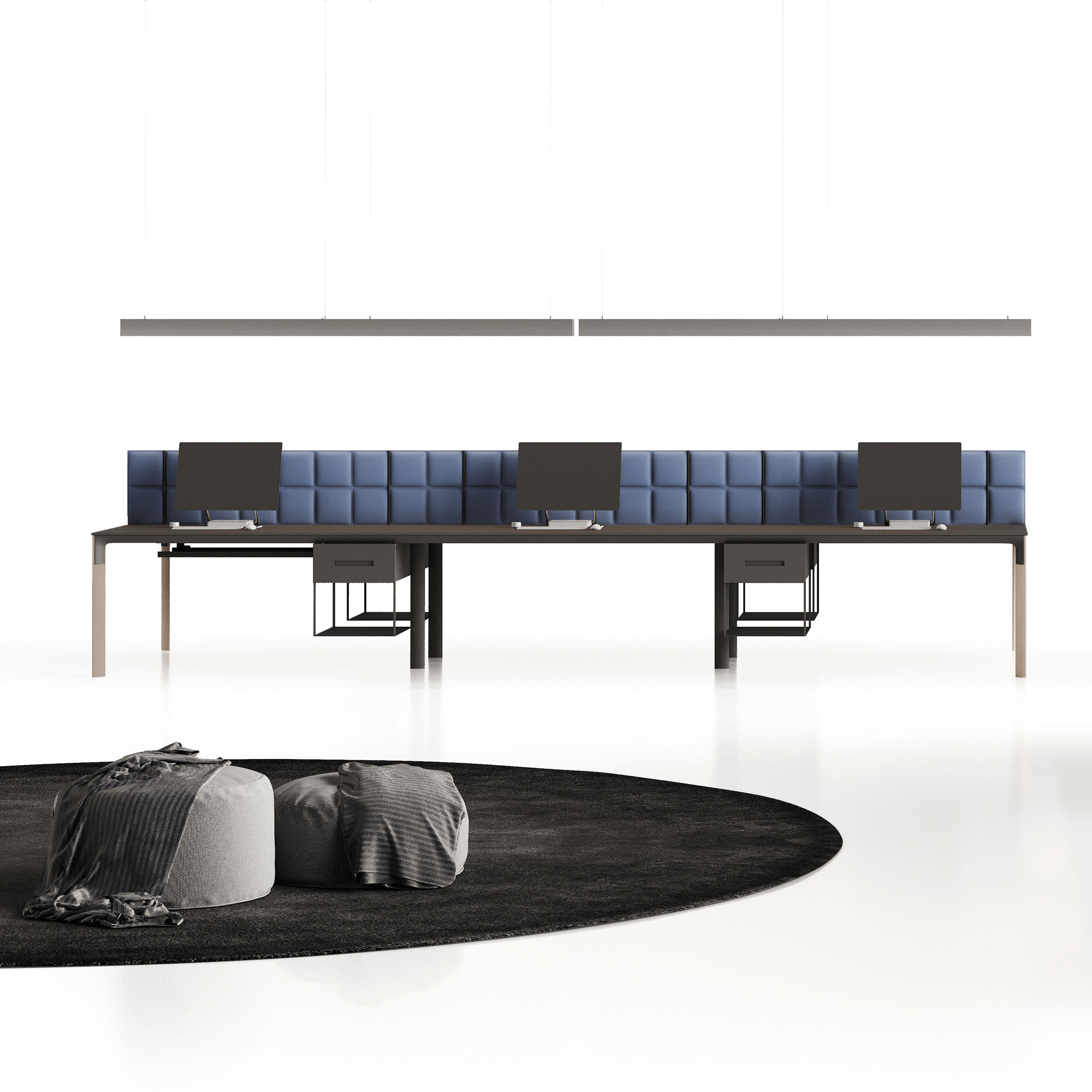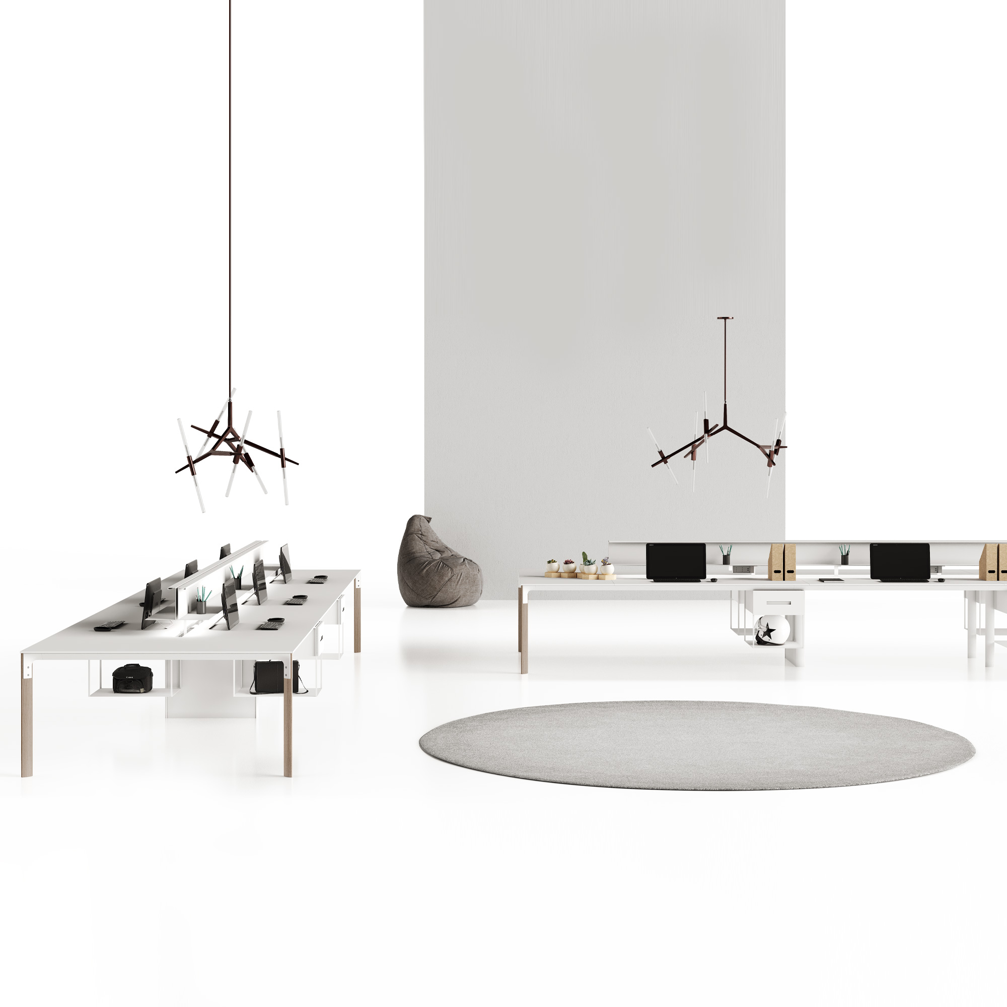 Seventy Seven is an office furniture system composed of a series of workstations characterised by a light and contemporary aesthetic: a thin top in 12 mm thick melamine melamine rests on an elusive structure embellished by connecting elements that evolve from the beams to embrace the leg.