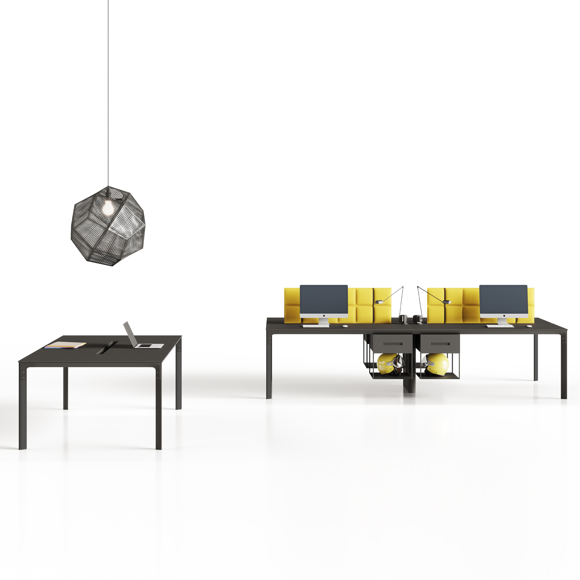 The sizing of the desk tops is taken to unusual depths (77 and 57 centimetres) so as to exploit a perfect modularity of tops and structure even in situations where the workstations are rotated 90 degrees to each other.