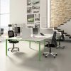 I piani sono disponibili singoli o doppi (con gamba condivisa), in diverse lunghezze e profondità, e possono essere dotati di screen divisorio frontale e laterale in metacrilato, legno (nella stessa finitura dei piani di lavoro) o con materiale fonoassorbente.