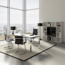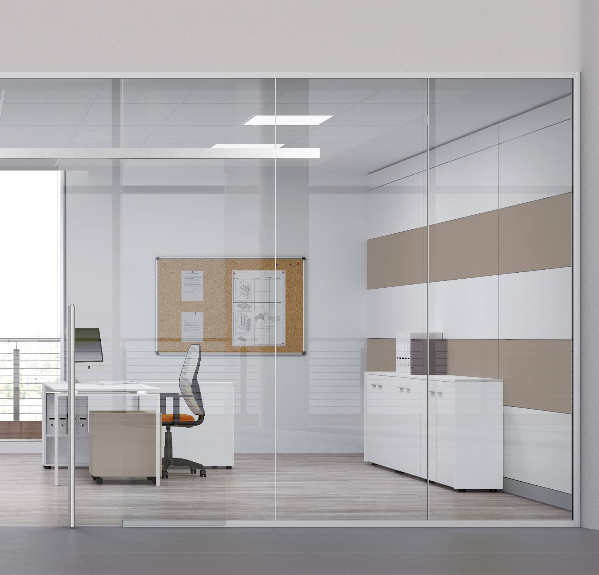 I piani sono inoltre disponibili nella versione Executive, che prevede piani in vetro temperato spessore 10 mm. retrolaccato nei colori bianco, ecrù, moka, rosso scuro e nero.