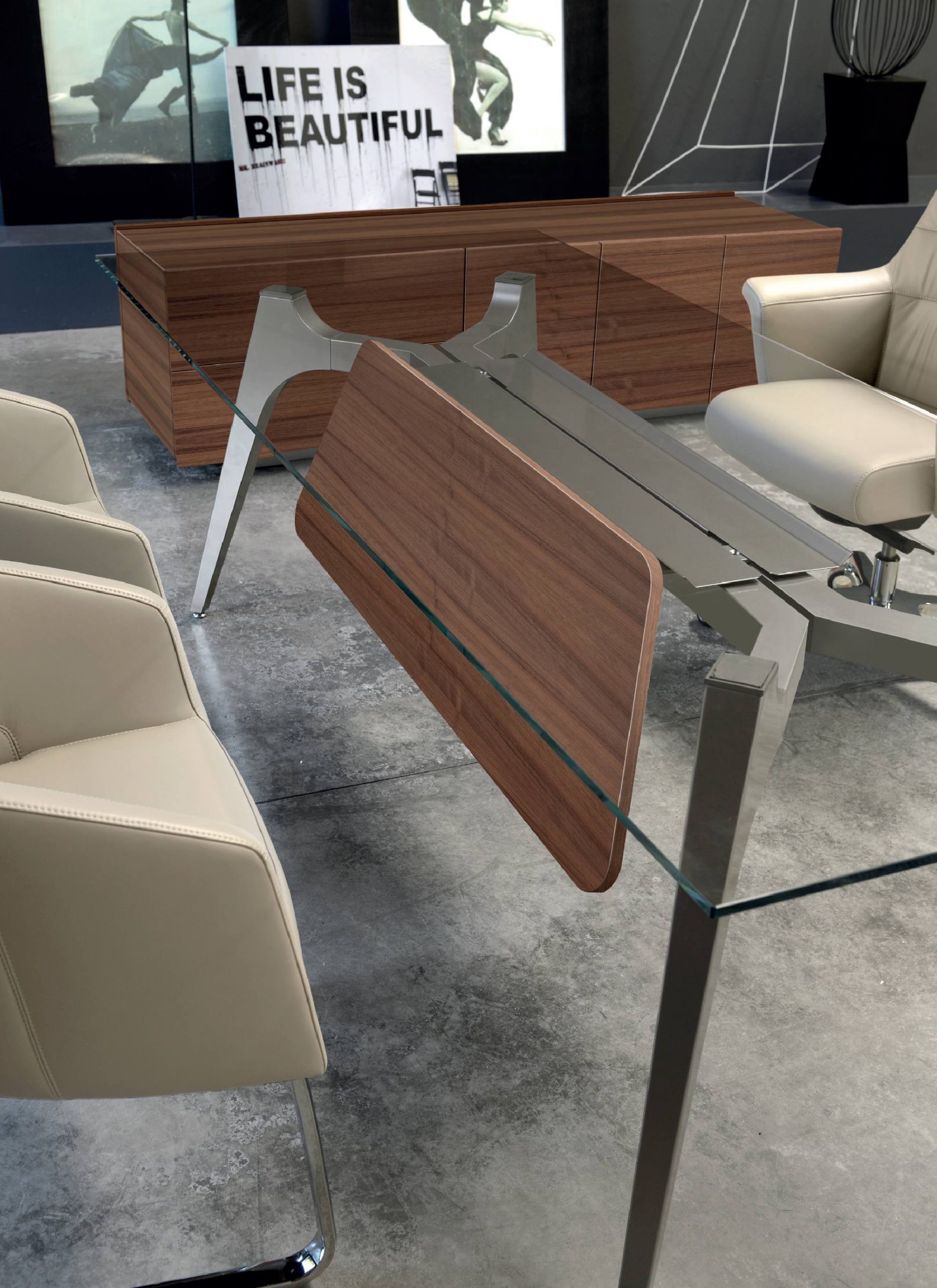 Il programma prevede scrivanie e tavoli riunioni anche modulari oltre a tavoli attesa e allunghi laterali per scrivanie. Tutti i piani in vetro sono in appoggio sulla struttura con appositi gommini antiscivolo.